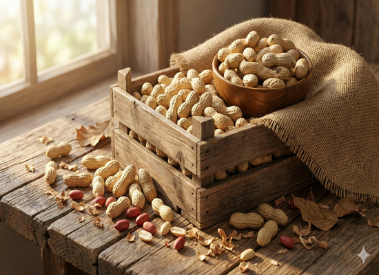 Export-quality groundnuts in shell with strong shells, high oil content, and uniform size, supplied in bulk for international markets.